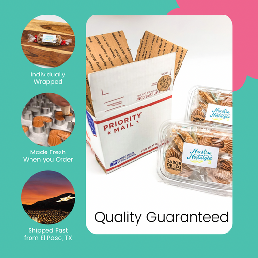 Experimente la rica tradición de nuestros Jamoncillos de Dulce de Leche, hechos a mano desde 1998. Nacidos en Juárez, México, y ahora preparados con el mismo cariño en El Paso, TX, estos dulces llevan el auténtico sabor de los recuerdos directo de nuestro negocio a su puerta. Déjese llevar por el sabor de siempre, que anhelamos desde la infancia y que nos hace sentir como en casa.